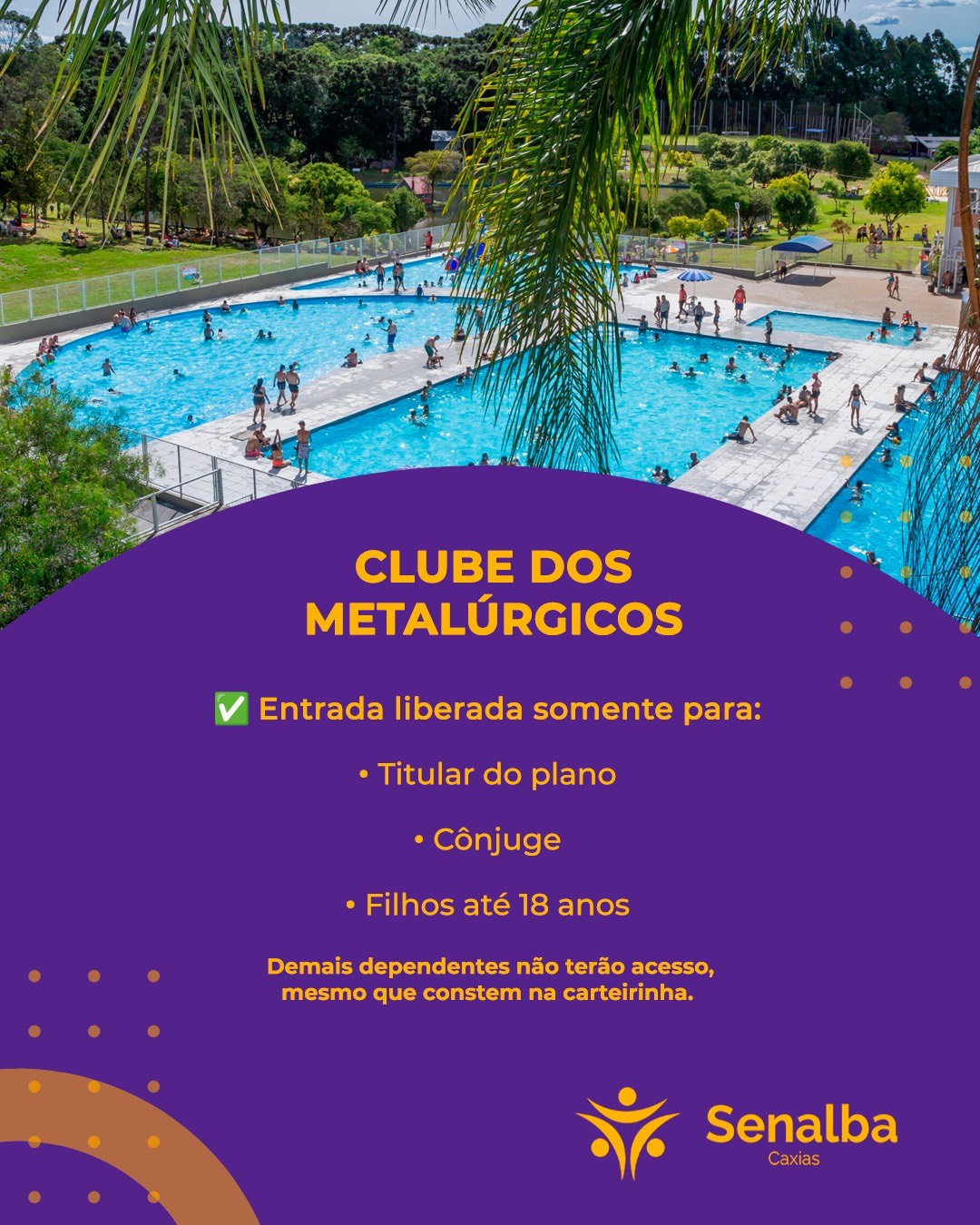 🏟️ Clube dos Metalúrgicos☀️ O calor tá chegando, mas atenção!Nesta temporada o acesso mudou:✅ Titular✅ Cônjuge✅ Filhos até 18 anos⚠️ Demais dependentes não terão entrada, mesmo na carteirinha.